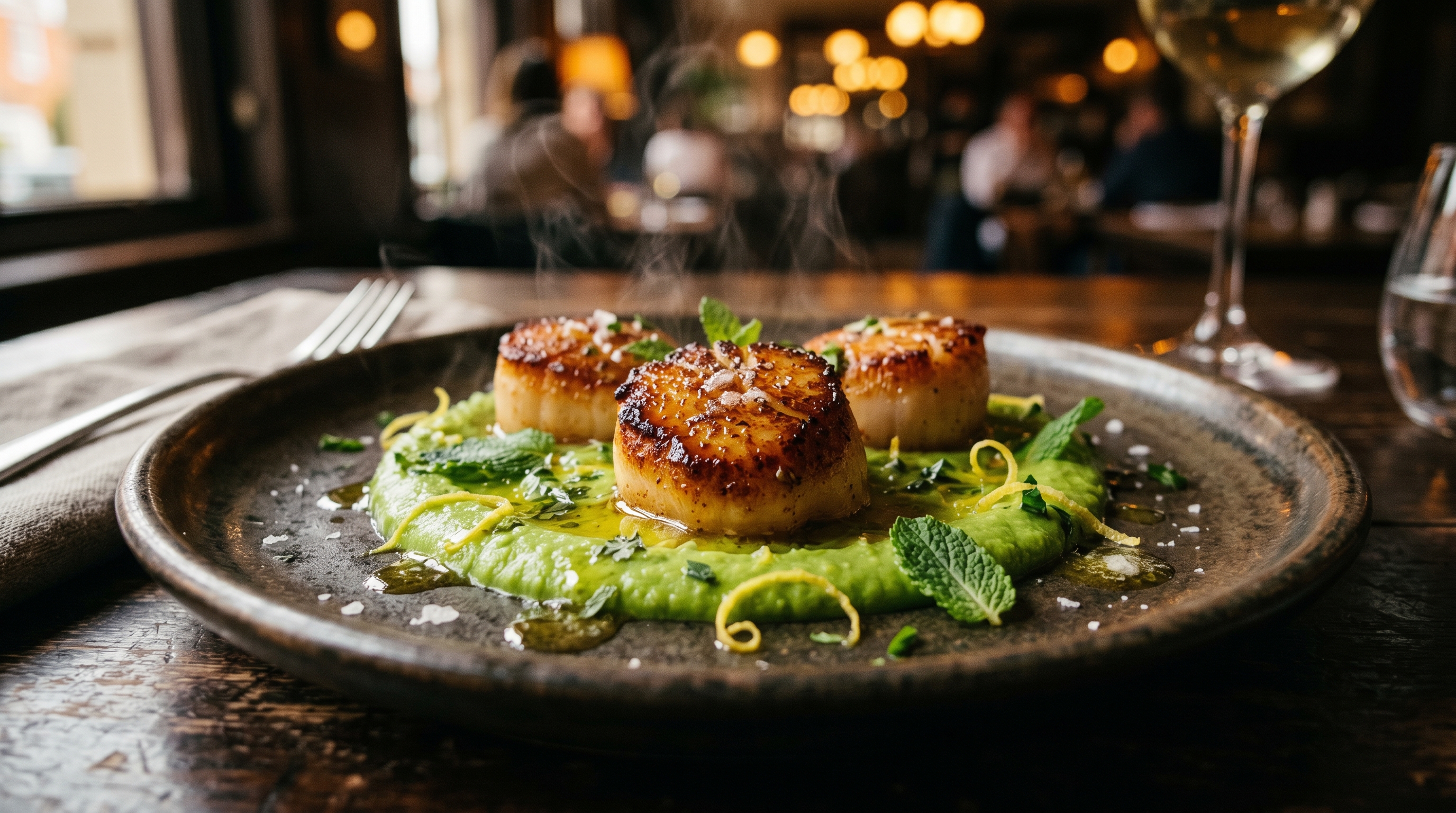 Butterweiche Jakobsmuscheln auf cremigem Erbsen-Minz-Püree – ein mediterranes Geschmackserlebnis in nur 20 Minuten.