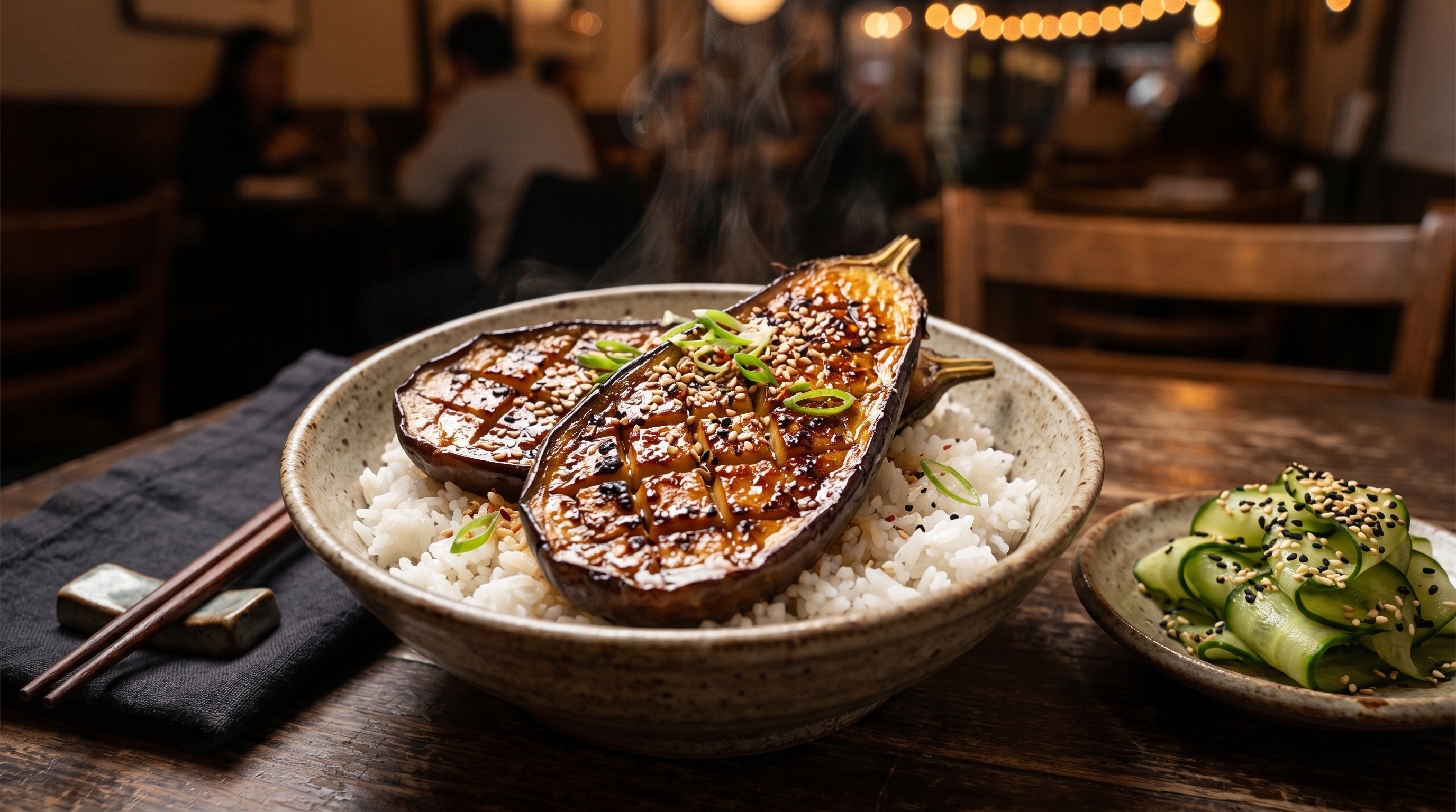 Knuspriger Miso-Auberginen-Bowl mit Sesam-Gurken und Jasminreis